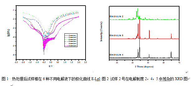 不銹鋼中含有較高的Cr、Ni, 溶液中很容易鈍化, 而且鋼中含有的碳化物及金屬間化合物大都比較穩(wěn)定, 所以電解液的酸度應(yīng)該比較大, 活性離子含量也應(yīng)較高, 在水溶液中進(jìn)行電解是比較困難的,如果用醇做溶劑, 對(duì)基體活化溶解的效果更好,同時(shí)可以抑制一些相的水副反應(yīng)的發(fā)生,并使電解后的表面光滑,從而減少損失,便于洗滌。試驗(yàn)首先考查了試樣棒2號(hào)在六種不同電解制度下(電解液不同,但均以醇為溶劑)的極化曲線(圖1)。即利用析出相與基體在電解液中穩(wěn)定電位的差別,外加電流使試樣極化,當(dāng)極化條件合適(即電極電位介于基體的穩(wěn)定電位與析出相穩(wěn)定電位之間),合金基體以一定的速度電解,目的相則以不溶性殘?jiān)男问奖惶崛〕鰜?lái)。圖1顯示腐蝕電流從大到小分別為電解制度4-5-2-6-1-3。因此,電解制度6,1,3的電解速度相對(duì)要慢。電解效果也證明了2205雙相不銹鋼在電解制度2,4,5中的電解效果比較好。而電解制度3和6的均出現(xiàn)明顯的點(diǎn)蝕現(xiàn)象。