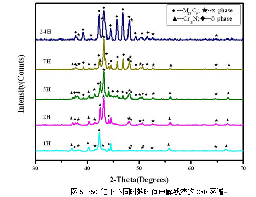 (2)750 ℃時(shí)效1 h后,析出相主要是以M23C6和Cr2N為主, 到2小時(shí),χ相開(kāi)始形成;5 h以后則有部分σ相出現(xiàn),而后伴隨著時(shí)間的延長(zhǎng),σ相越來(lái)越多,相應(yīng)χ相開(kāi)始減少,到24 h時(shí),σ相已經(jīng)占主導(dǎo)地位,且形成的晶體很完整,XRD圖譜峰和清晰明顯。