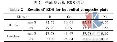 對熱軋后芯層中的硼化物及復(fù)合板界面處進(jìn)行了eds分析,結(jié)果如圖3及表2所示。芯層中硼化物的b含量達(dá)到42.72%,原子分?jǐn)?shù)達(dá)到79.23%,根據(jù)fe-b二元相圖[8],判斷該物相的成分中含有fe2b相。芯層中的硼化物除含有較多的fe 外,還含有一定量的cr、ni。cr元素由于是易形成碳化物的元素,而且具備生成cr-b化合物的熱力學(xué)條件,因此推斷該相中cr的存在形式有兩種: cr的碳化物和cr2b,綜上可知芯層塊狀硼化物的主要成分為: cr的碳化物,fe2b和cr2b。界面處硼含量較低,但cr含量較高,說明界面處的組織仍主要是α-fe基體相,但界面附近存在有少量由芯層越過界面擴散到覆層而形成的二次硼化物。