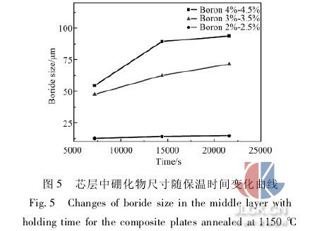 復(fù)合澆鑄過程中芯層與覆層界面處的間隙通過大變形量的熱軋變形完全可以實現(xiàn)冶金結(jié)合。擴散處理過程中硼原子在界面附近的擴散速率很低并且隨著中間層硼含量的增加變化的程度不大。隨著保溫時間的延長,硼原子的擴散距離也在增加,但其擴散速率是逐漸降低的。雖然硼化物在保溫過程中的粗化行為近似滿足
